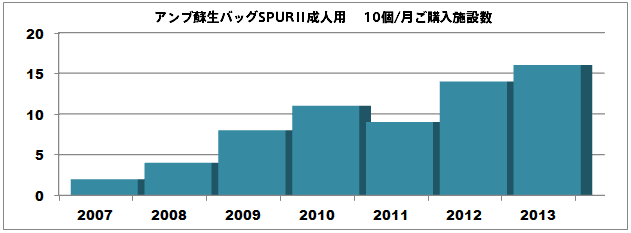 インシデント対策のひとつとして、バッグバルブマスクのディスポーザブル化を検討される医療機関も増加し、SPURⅡの出荷も大幅に増加しました。月平均10個以上ご購入いただいている施設も、2007年(平成19年)の2施設から2013年(平成25年)には16施設に増加しています。