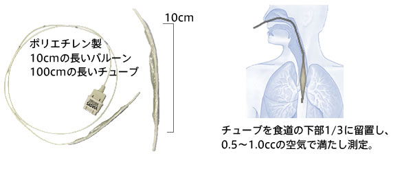 AVEAコンプリ2による肺内外圧差の測定では、食道内にバルーン付きチューブを留置させ、吸気終末時と、呼気終末時のそれぞれの肺内外圧差を測定します。