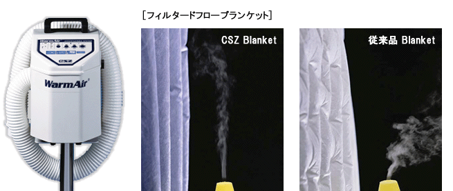 | ・ | 従来品の吹き付け方式の温風式加温装置とは違い、対流時間が長く、皮膚表面積を広く加温できる各種フィルタードフローブランケットをお試しください。 |