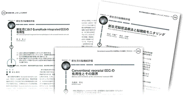 新生児領域でaEEGを用いベッドサイドで連続的に脳機能をモニタし、評価ができる。HIEではエコーによる脳内血流状態のモニタリングが脳温測定と同様に重要。脳組織が低酸素下におかれると神経細胞障害さ進行するため脳低温療法中はNIRSによる脳組織酸素飽和度のモニタリングが有用。