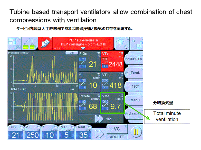 最近のタービン型搬送用人工呼吸器Monnal T60は分時換気量のモニタリングが正確で、CPR中も陽圧換気を行えます。分時換気量を見てみると換気のほとんどがCPRによって補われている事がわかります。人工呼吸器から設定された換気は割合としては小さいものです。