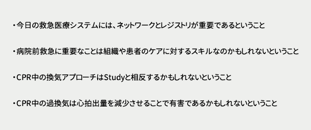 ご講演の中で「CPR中の過換気は心拍出量を減少させることで有害であるかもしれないということ」をはじめ救急医療の課題と可能性をいくつもご提示されており、大変興味深い内容となっています。