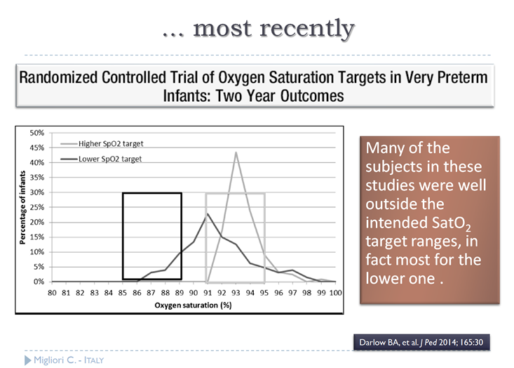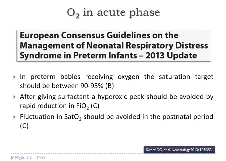急性期において、酸素投与による副作用を防ぐために①SpO2の目標値は90%~95%に設定され、②サーファクタント投与後には、高酸素血症を防ぐために、SpO2を注意深くモニタリングし早急にFiO2を低下させる事、③出生後期ではSpO2の変動を避ける事が推奨項目となっている。