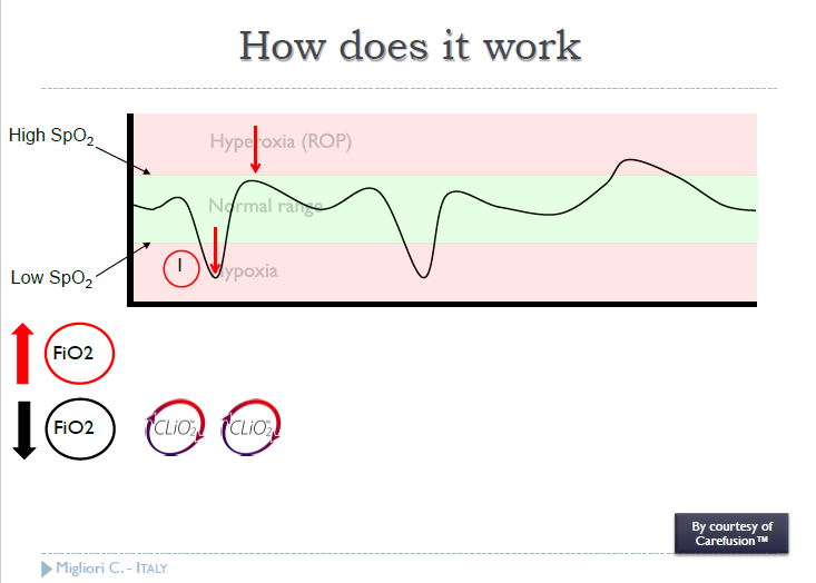- クローズドループFiO2システムは、目標範囲内のSpO2を維持することに寄与する。SpO2の変動や手動制御と比較して重度の低酸素血症または高酸素血症の時間を減少させる。