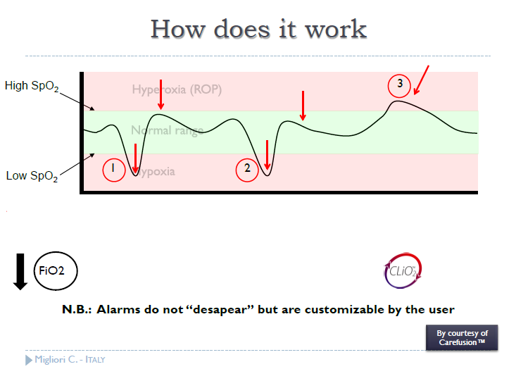 図に示されるように、SpO2が目標値未満に低下した際には自動でFiO2を上昇させ、SpO2目標値の上限を超える様な動きにはFiO2を低下させる、この一連の動作をアラームが鳴動する前に自動調整する。ただし、ユーザーが任意にアラーム値を設定することも可能である。