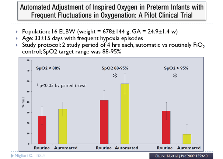 ELBW(極低出生体重)14名に対し、クローズドループシステムで2時間、手動操作(SpO2をモニタリングし、FiO2を調整するためだけの専任看護師)も同様に2時間人工呼吸管理し、FiO2の調整を評価した。結論としてクローズドループシステムの方が専任看護師と比較し、目標範囲内を維持することができた。看護師対患者比を1:1にして、FiO2を調整する専任看護師を配置することは当然、現実的ではない。