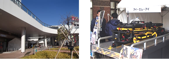 会場となりました相模原駅前ユニコムプラザさがみはらボーノ広場1F屋外に設営された特設テント内に、「Stryker社電動昇降・収納ストレッチャーシステム」を設置。