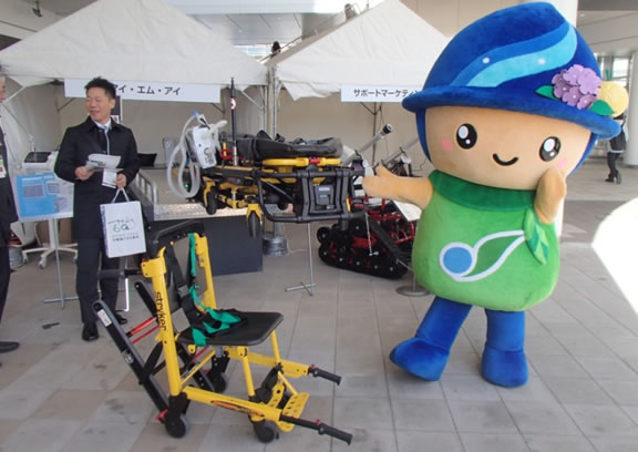 救急車に擬した専用台に新しい電動ストレッチャーが鎮座。スタッフとともに来場される消防関係のお客様をお迎えいたしました。