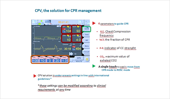 リシャール先生は、これまでの生理学的知見や世界中で実施されてきた研究を基に、Air Liquide Medical System社と共に、ガイドラインに基づいたCPR中に最適な換気を提供する人工呼吸器の換気モードCPV(Cardio Pulmonary Ventilation)の開発を決断されたと、その経緯について説明されました。