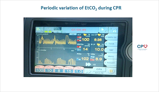 上記のスライドではCPVモードを世界で初めて使用した症例を提示されました。下段がEtCO2ですが、特異的な波形が呼吸毎に認められますが、これら波形に関する文献報告は一切なく、解釈が非常に難しいとのことです。そのためリシャール先生のご施設では、データを集積するためにCPR患者のEtCO2データを毎回記録されておられ、数例の特徴を解説されました。