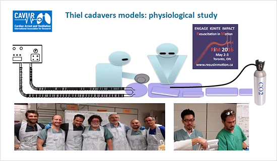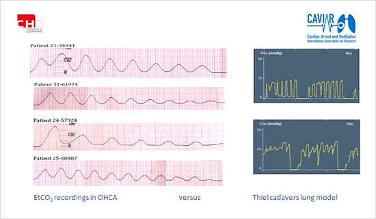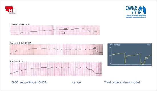 胸骨圧迫、圧迫解除により気道虚脱が発生し、フロー制限が掛ることによって、EtCO2の波形は振幅がないパターンを示すケースもあり、現在、献体を用いた研究をカナダで実施しています。献体の肺にCO2を持続的に添加し、循環によってCO2が産生されていることを再現しながらCPR中の換気が与える影響について研究されています。