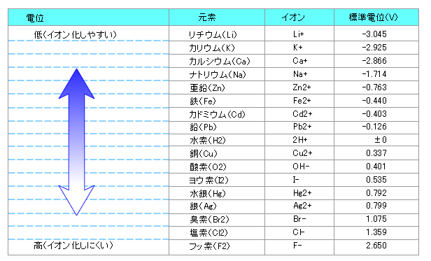 この電圧は、+極の持つ電位と-極の持つ電位の差によって決まります。電位は用いる材料固有のものであり、イオン化しやすいもの(電子を生み出す力が強いもの)は電位が低く、イオン化しにくいものは電位が高くなります。このような金属の「イオン化しやすさ」をイオン化傾向と言います。以下に、各金属のイオン化傾向についての表を示します。