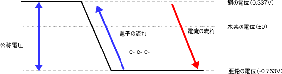 例えば、この表を元に、+極が銅、-極が亜鉛のボルタ電池の電圧を求めると、0.337V-(-0.763V)=1.1Vとなることがわかります。