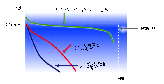 上図のとおり、リチウムイオン電池は、乾電池に比べると比較的平坦な放電曲線を示すことから、放電特性に優れた電池といえます。