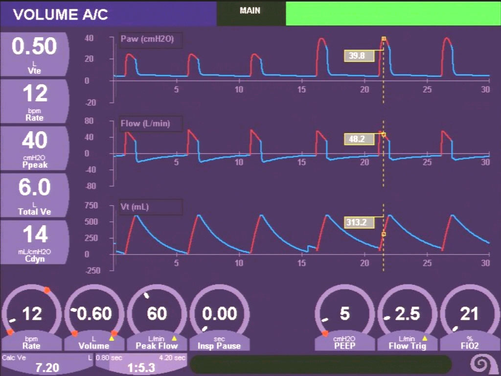 実測値は、1回換気量500mL、呼吸数12回/分、ピークフロー40L/分、分時換気量6L/分、動的コンプライアンス(Cdyn)14ml/cmH2O。