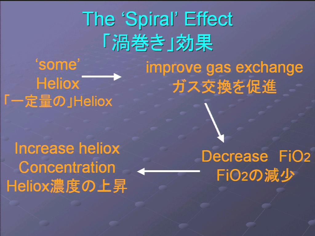 この「渦巻き」効果を得ることにより、Helioxを増加させることで、酸素化を増し、同時に投与するヘリウムの量を増加させることができます。