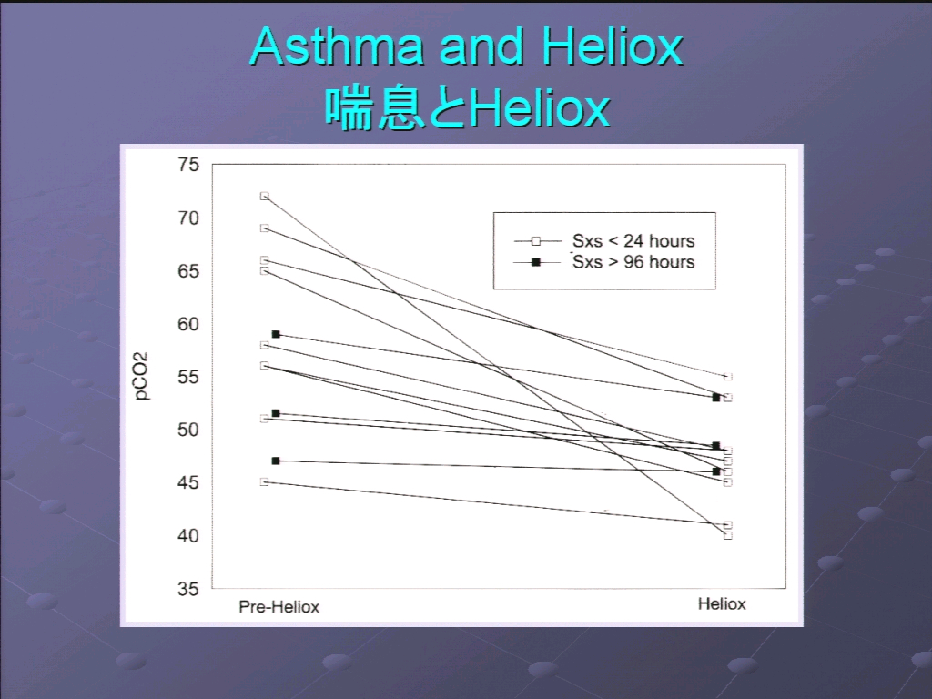 つまり、患者さんは30%酸素を受けることができたわけです。幸運にも患者さんの酸素化要求は上昇せず、高濃度のHelioxを使用することができました。1時間後にPaCO2は89から67に低下。患者さん は改善を続け、30時間後には抜管できました。