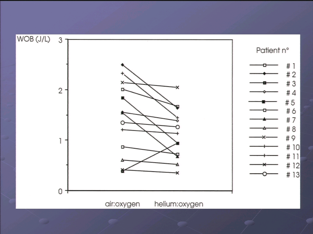 左側のスケールに呼吸仕事量が示されています。左側がエアーと酸素、右側はHelioxを使った患者さんの呼吸仕事量です。一人の患者さんを除き、Heliox使用例で呼吸仕事量が減少しています。
