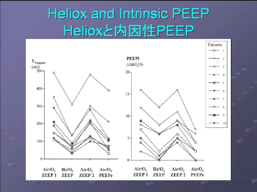 人工換気を受けてい るCOPD患者さんにおいて、内因性PEEPとエアートラップがHelioxの使用により減少していることを彼は発見しています。