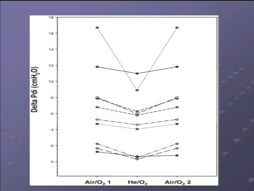 明らかにこの時期では、患者さんは内因性PEEPに打ち勝って人工呼吸器をトリガしようとしています。1人の患者さんを 除きHelioxにより呼吸仕事量が減少しています。