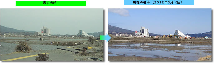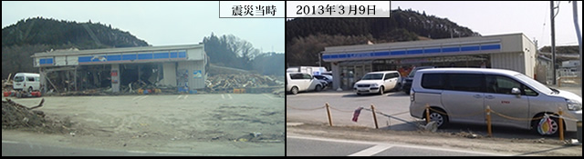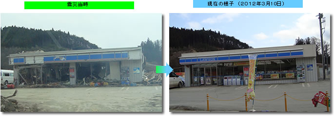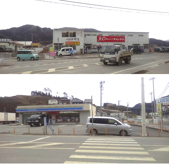 コンビニを含む一帯は、海から2~3km離れているので、川沿い【コンビニは川沿い】を除き被害は拡大しておりませんでした。その分復旧も早く、未だ仮設店舗が多いのですが、大分元の町並みを取り戻しつつ有ります。本格的な店舗もちらほら出来ております。