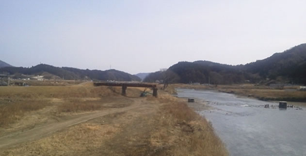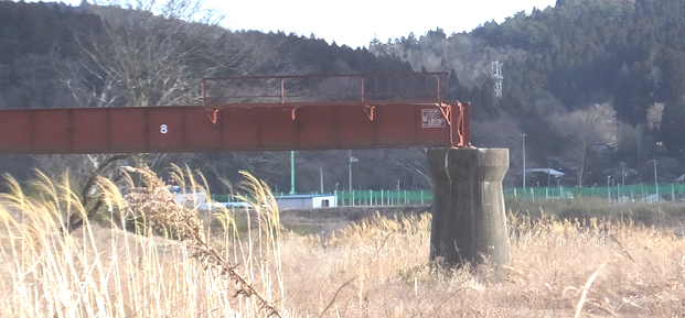 震災直後と1年後は線路が引きちぎられた状態で、橋脚から突き出ていましたが、現在は線路は撤去され、橋脚のみが川に突き出ている状態です。