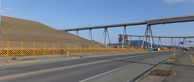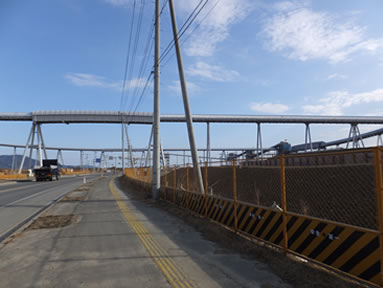 一部残っているのは、海岸沿いから高台に向けた橋脚部分です。これは、ベルトコンベアーは取り外しても橋脚部分は、将来の有効活用のために残しているのだと思います。片側一車線は確保できそうな幅広さがありますので、近い将来道路が掛けられるのではないかと思います。