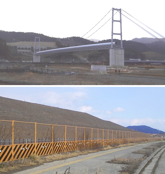 昨年は沿岸部と高台を結ぶベルトコンベアー1本しかなかったのですが、今年は平地の至るところに出来ておりました。平地に無数に造成地を作り上げ、その殆ど(多分全部)が10m以上嵩上げされております。相当量の土砂を運びこんでいるものと思われますが、あれを全てダンプカーで運ぶよりも、最初にしっかりとしたベルトコンベアーを建設する事により、却って効率も上がり、工期も短くなるものと思われます。