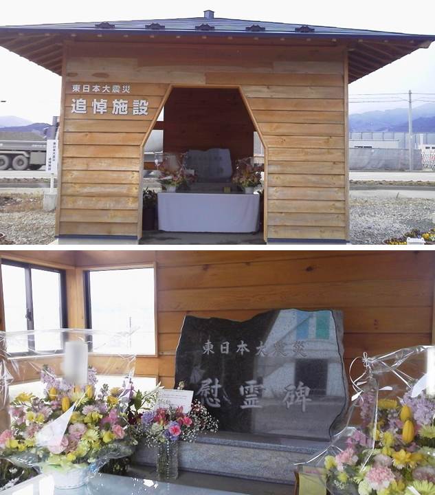 震災が金曜日の午後だったので、昼食で利用しなくても立ち寄っても不思議ではない曜日であり時間帯だったので、ここを訪れる度にぞっとする思いです。その敷地内に、『東日本大震災 追悼施設』がある事を知り、初めて訪ねてきました。調べてみたところ、3年前にできていましたが、昨年迄は何度も通りすぎていても、気が付きませんでした。その中には、千羽鶴や供花が供えられていました。