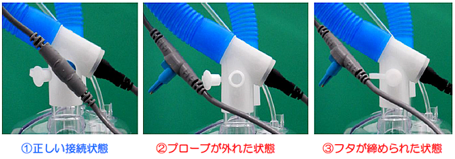 - 呼吸回路の組み立て間違いや、使用中にプローブが引っ張られることで発生しています。