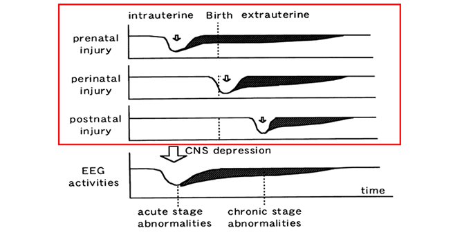 この脳損傷がいつ発生するかによって異常のタイプが異なります。出生前に発生した場合、慢性的異常も見ることになるでしょう。その場合、aEEGはあまり有益ではありません。しかし分娩中や分娩後に何か起こった場合、そして脳損傷の直ぐ後にaEEGを取り付けた場合、有益な情報を数多く見ることができるでしょう。