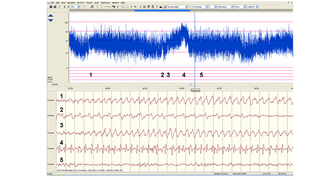 しかし既に申し上げ、またお示ししましたように、治療を受けた新生児は非常に難しいものです。ここでてんかん発作が見られますが、このてんかん発作は誰もが認識できるでしょう。このてんかん発作も。しかし、ここではhump(へこみ)が見られます。下側にはこれに該当するEEGパターンがご覧頂けます。記録全体を見る必要があります。